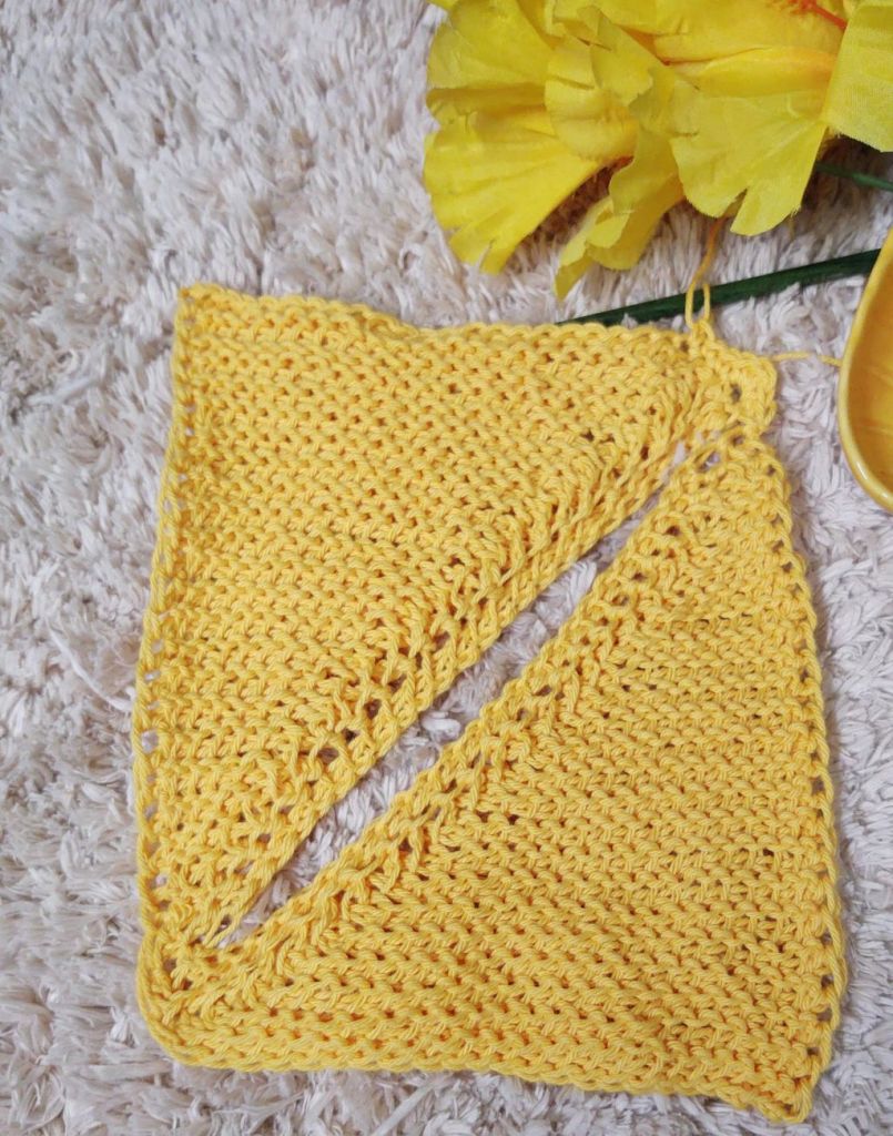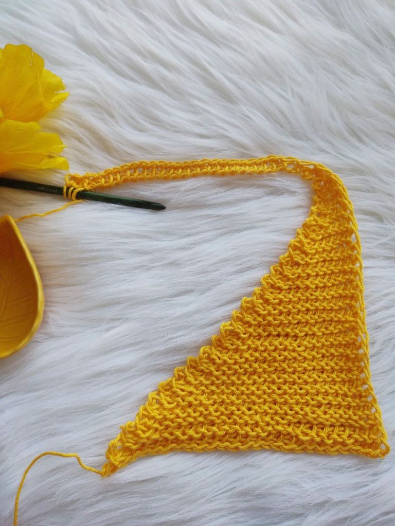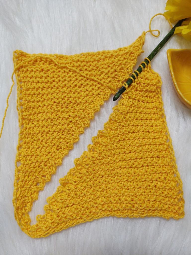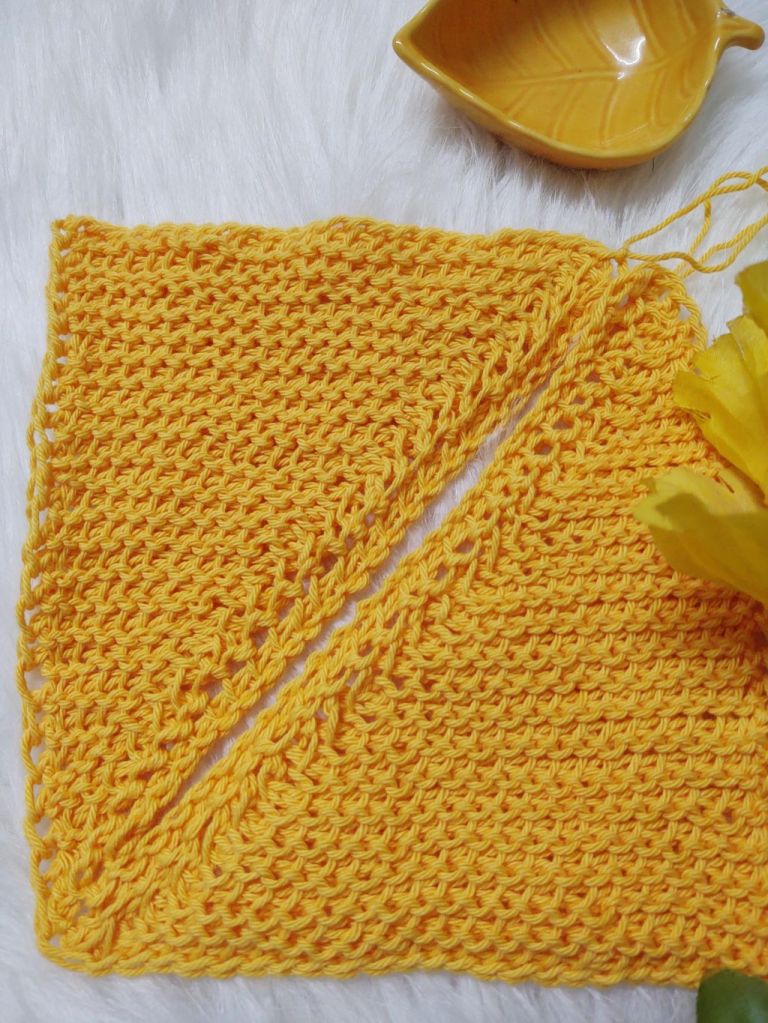 For today’s post however, I am not combining these two stitches. We will be using the stitch to form a square using the short row technique , making two triangles and seaming the diagonal ! This time the short row technique we are going to use is to leave the last stitch unworked.