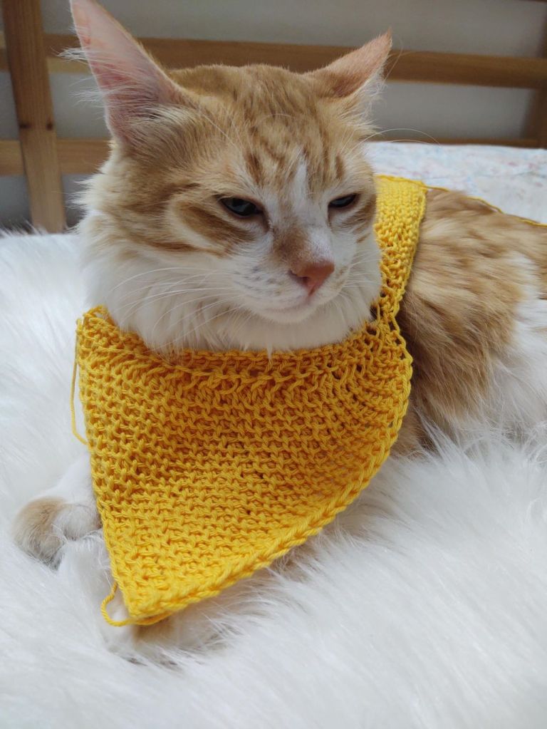 As I was getting ready to seam , my furbaby decided that I had done enough work and demanded cuddles! On a whim I put the unseamed piece around his neck and he seemed to enjoy it!