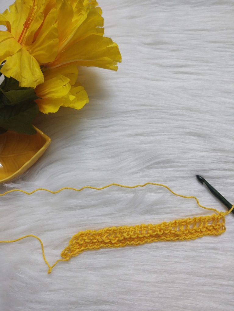 Row 4- Row 25: repeat FP and RP of row 3. At the end of each row you will have one stitch less than the previous row.