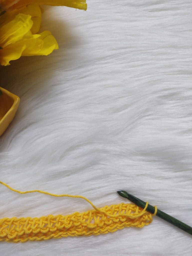 I like to combine this stitch with the Tunisian Simple Stitch and the resulting fabric shows off a lovely honeycomb texture. Earlier , before I found the joy of using bigger hooks , I used to alternate Tunisian Simple Stitch(TSS) and TPS to help with the curling of the piece. Just one row of this would suffice to help reduce the curl! I would also use it as a border around my piece.