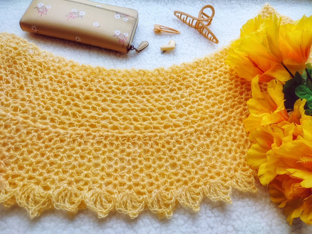 The stitches used give this neck scarf a natural bias which gets corrected when we block. We have steam blocked the sample piece and it has opened up beautifully.