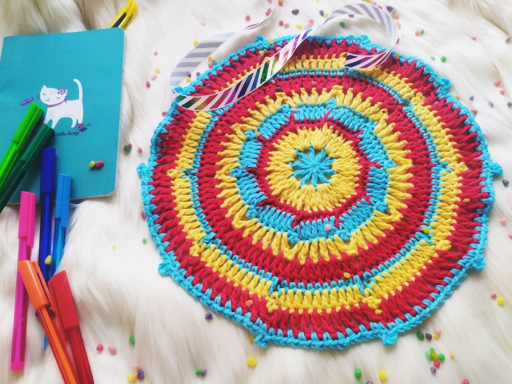 The feature pattern for this blog hop is our Scintillating Dreams Mandala that is designed with 4 ply cotton yarn and a 4 mm hook. We went with fall colours but any colour scheme will look just as pretty! We also tried the pattern with fingering weight and it turned out super cute (if we say so ourselves) like a mini version of the mandala!