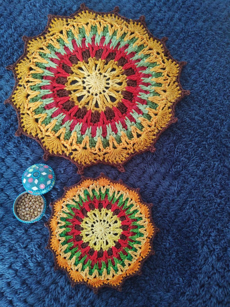 The mandala measures 11″ after blocking and the mini measures 4.5″ after blocking!