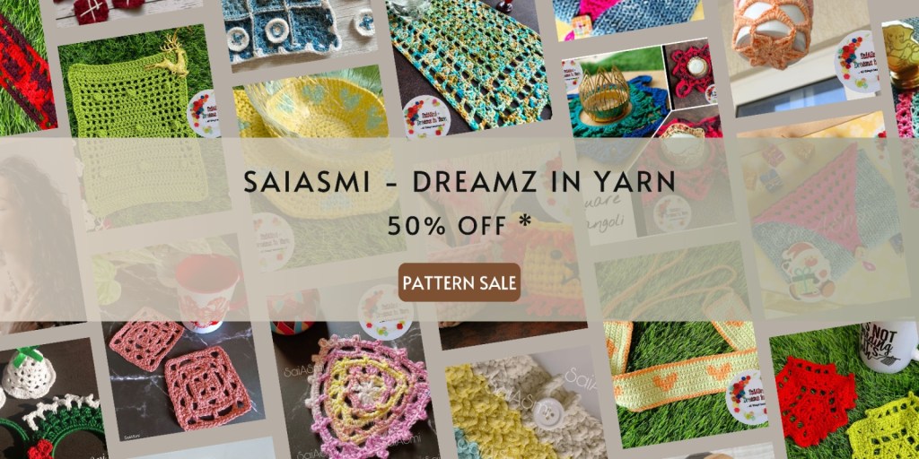 “SaiASmi – Dreamz in Yarn offers you on Black Friday through Cyber Monday – 50% OFF on ALL Patterns on a minimum cart value of $5.99. This offer includes all individual patterns (old and new) and e-books”.