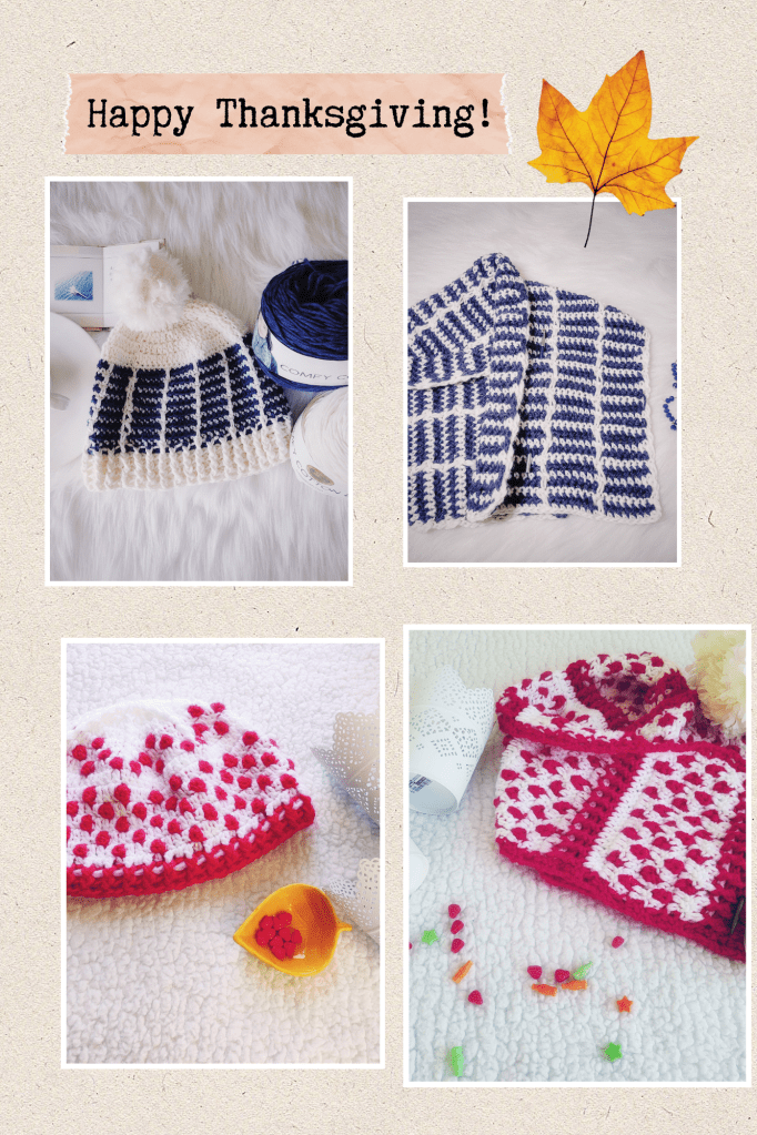 For this sale I am offering you all an ebook of my favorite hat and scarf set that I had designed in 2021!, Thanksgiving Hat_scarf at 50% off! You get 4 patterns , 2 beanies and 2 scarves! This sale is currently active and runs until November 30th 2023!