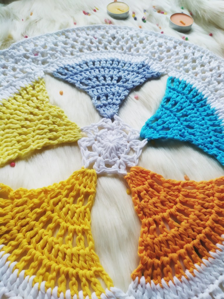 When Audrey of Canoe Mtn Designs decided to host a Scrap Busting blog hop event , I jumped in! As a co-designer at ViVaCrochet , we have several patterns that fit the bill for using scraps! However , the one that I really love is the Spring Dance Mandala. The Spring Dance Mandala is an experiment of cutting and joining new colors in sections halfway through the pattern. I had suggested this name as the colorful fans in the mandala look like skirts that are spinning in dance on a Dandiya Night!