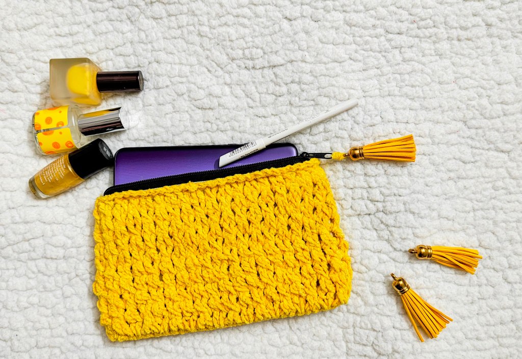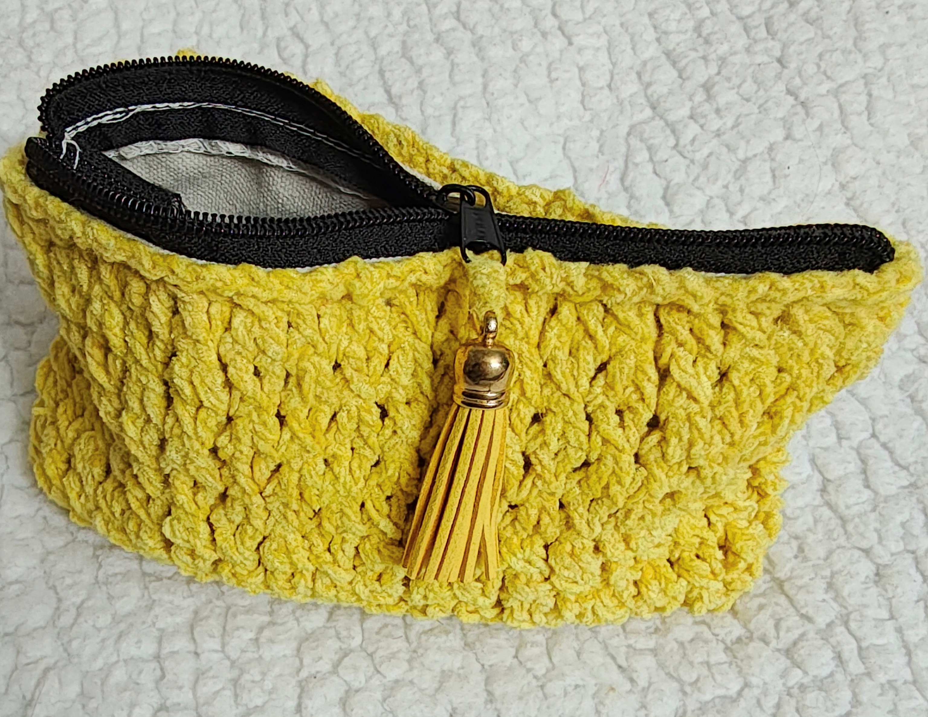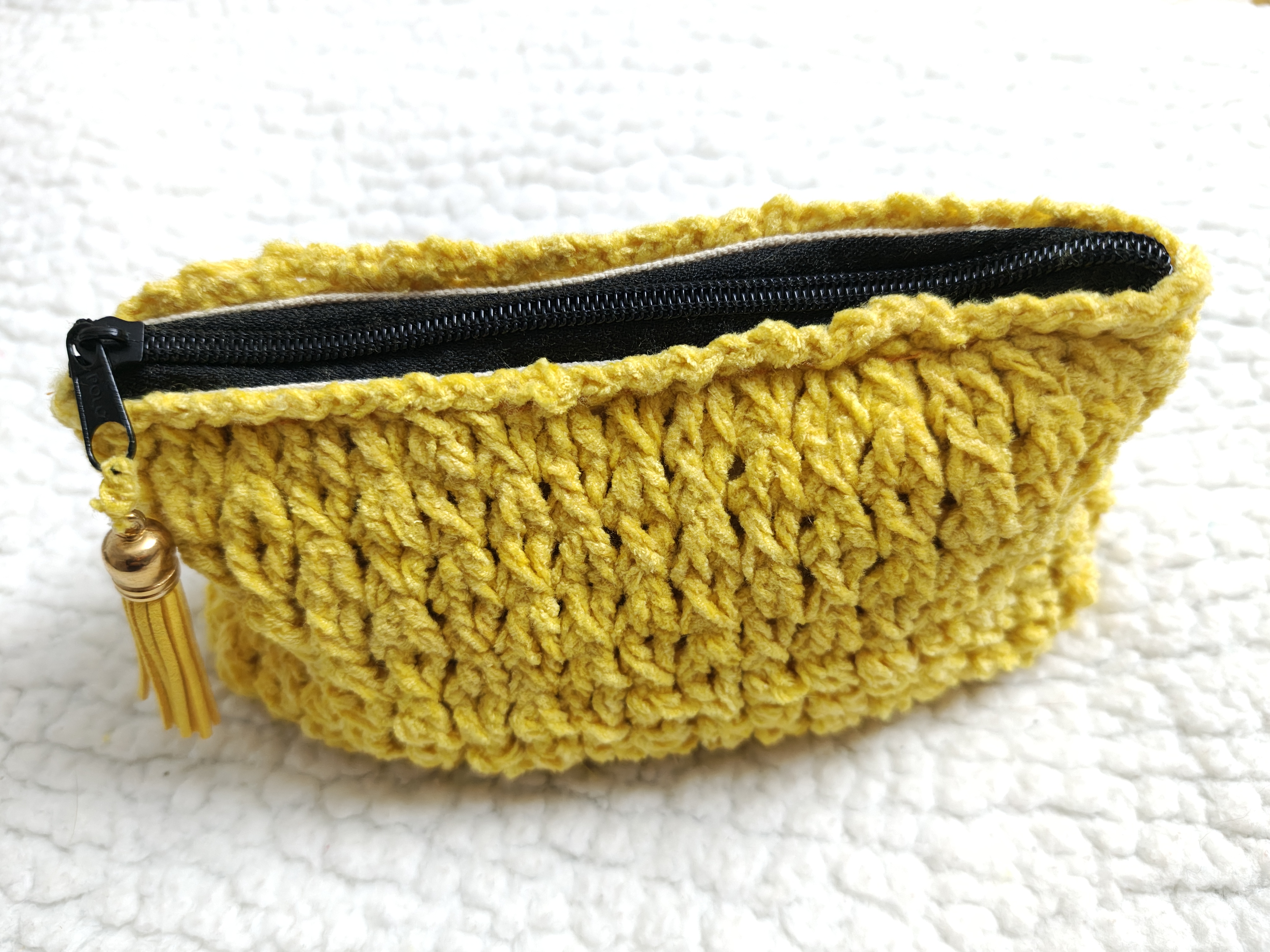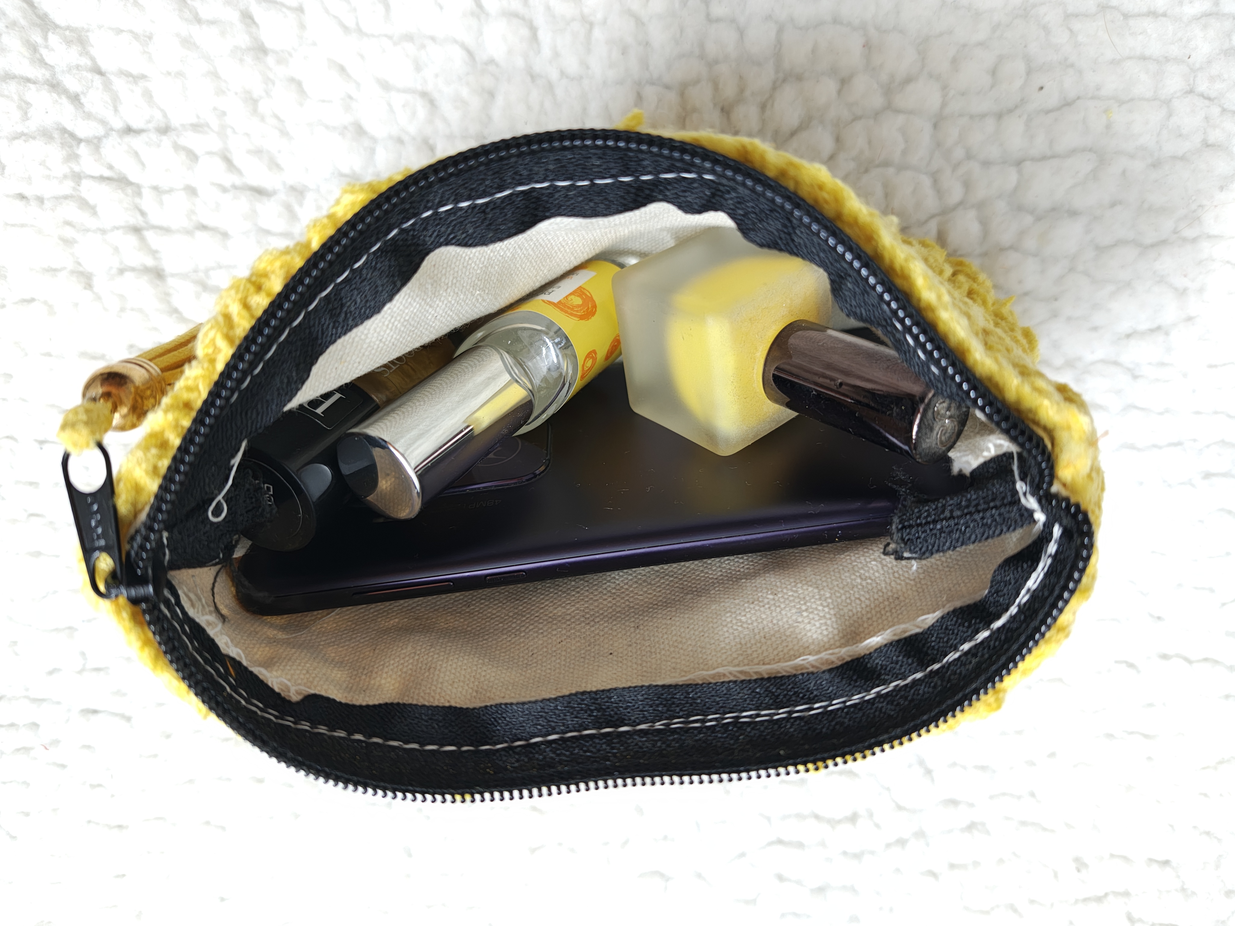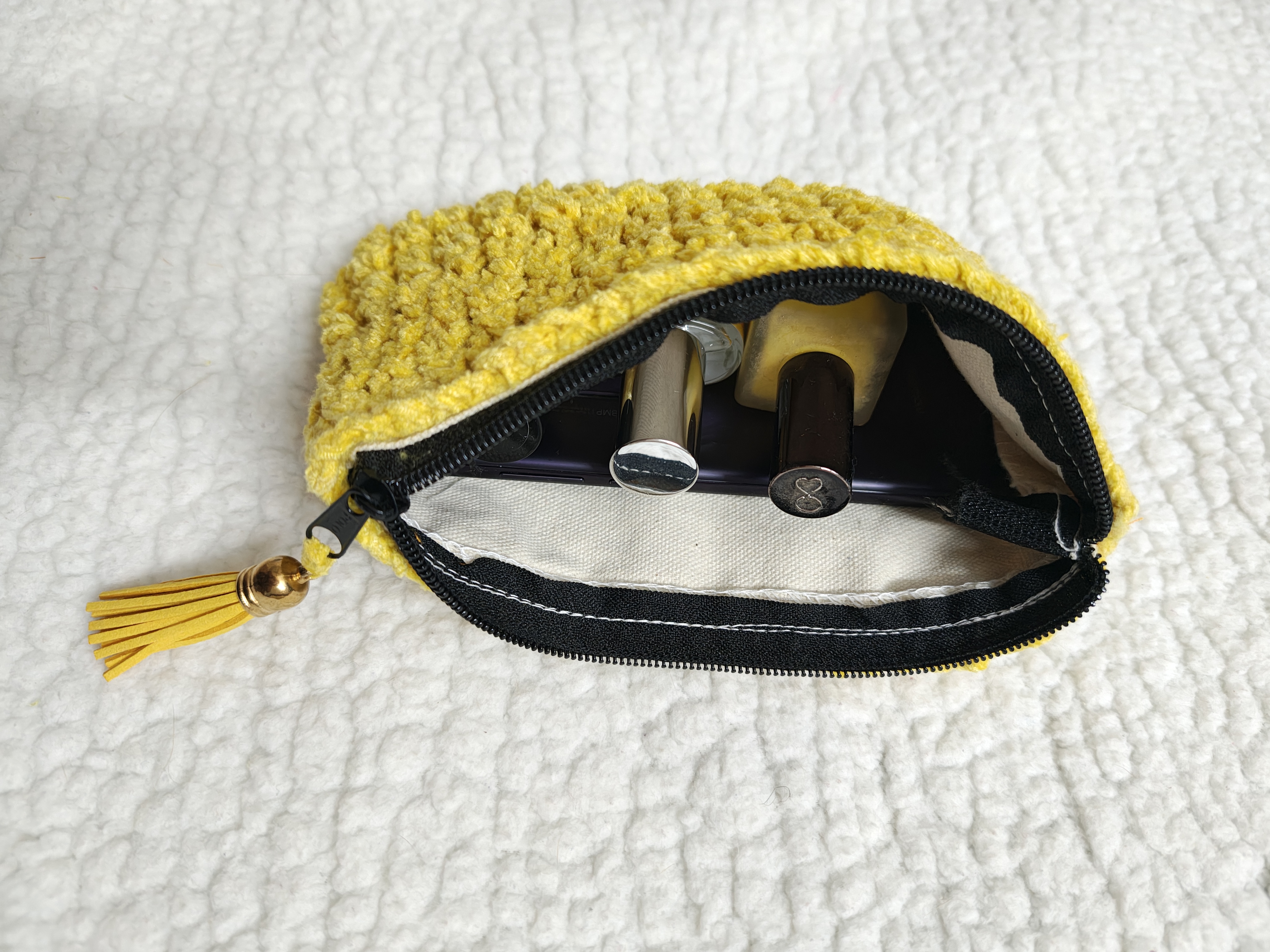 1: The instructions are given to match the canvas pouch that I used for the lining. If you are using something different or are sewing your own lining, you can change the width by changing the starting chain to have a multiple of 6 + 3 chains.