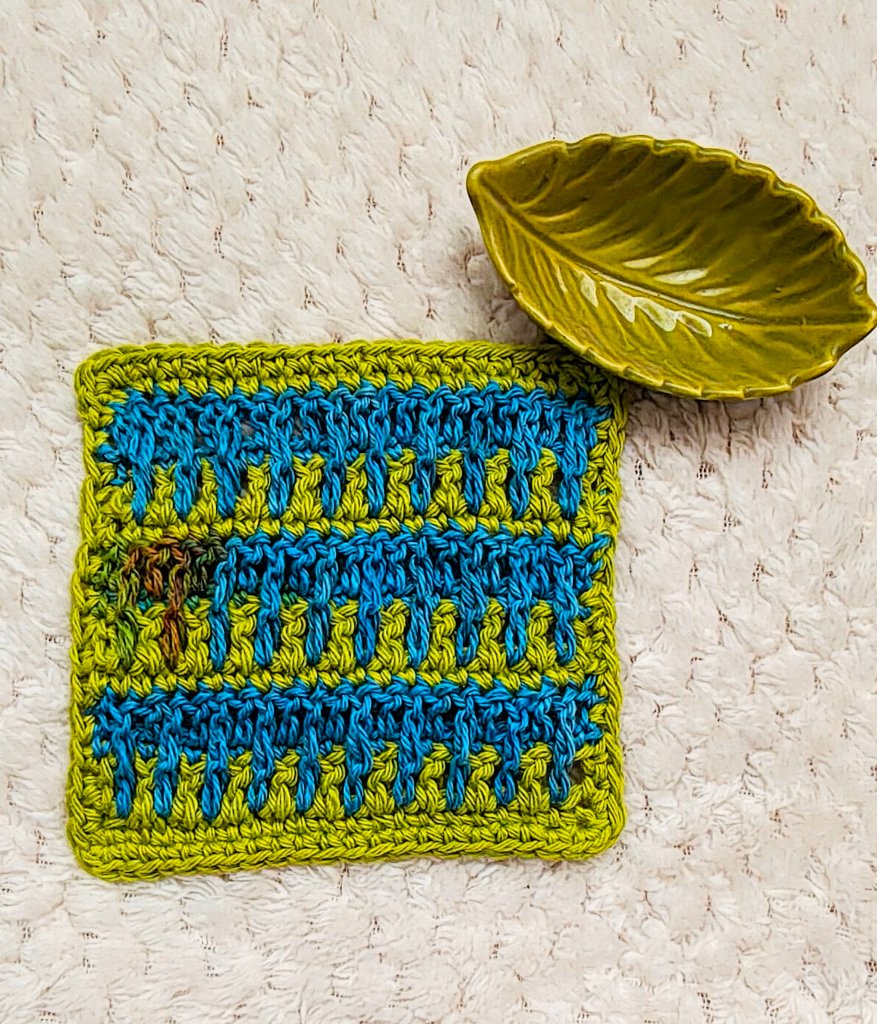 Just start with chain 22 and follow the instructions. My coaster has 3 pattern repeats and measures 5.5″ square. I used approx 13 yds of CC and 10 yds of MC for one coaster.