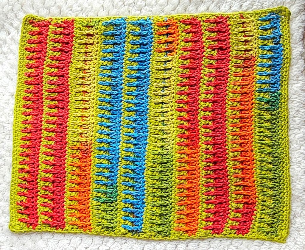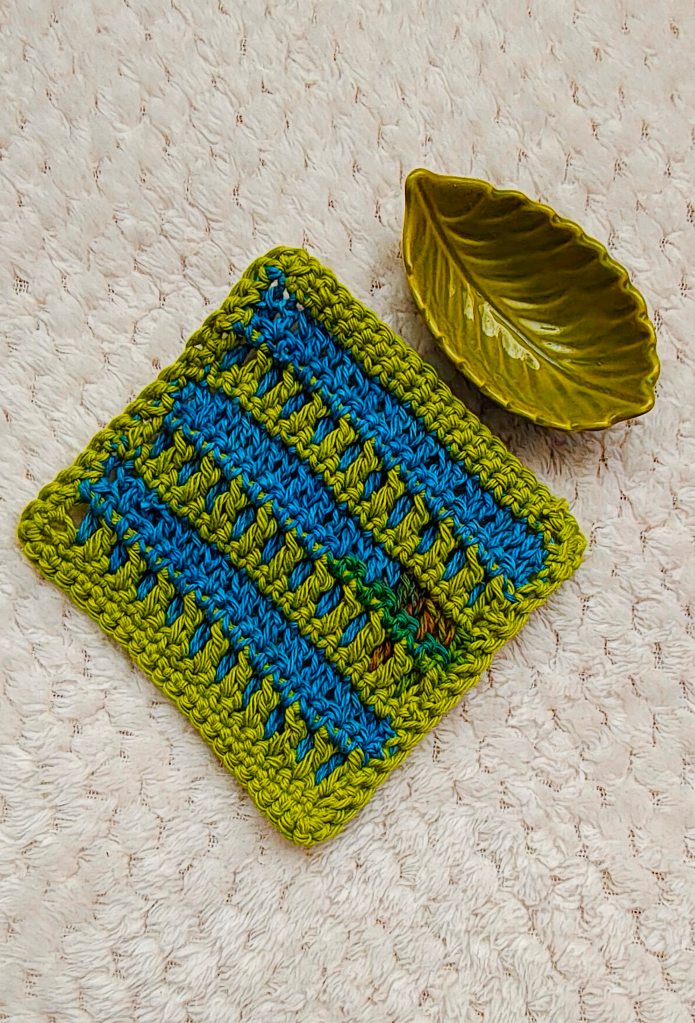 I combined the Variegated with a solid cotton in celery green colour , also from Ganga Yarns, This yarn is called Cotton Delight! Just right for this project! No affiliation with the yarn company , just happy with the products!
