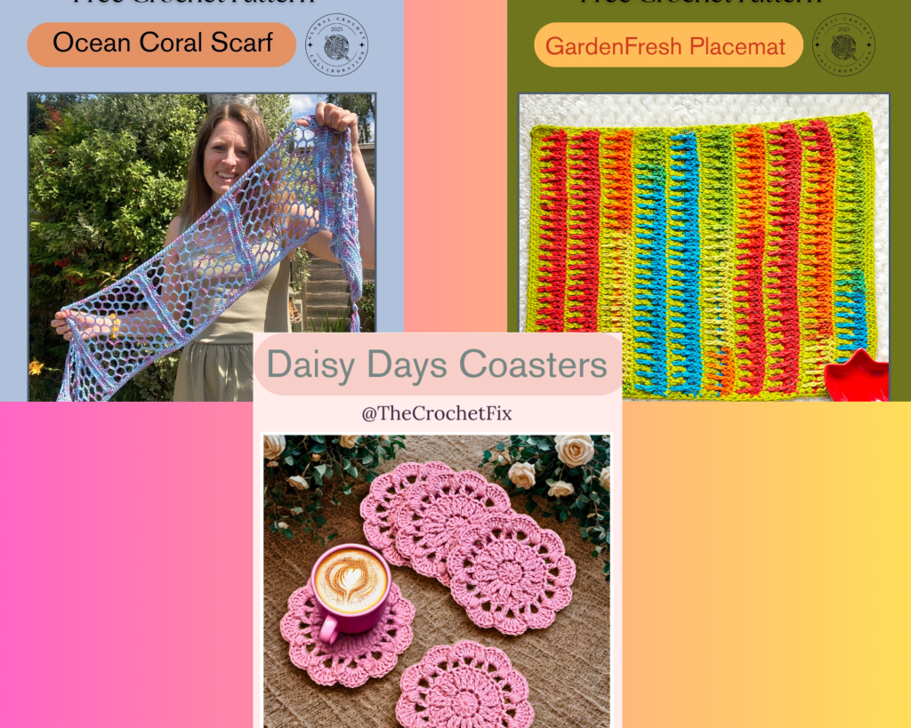 “Sweet crochet coasters featuring a central textured daisy motif. These coasters whip up quickly and are a practical, relaxing and satisfying project.” – says the designer and I agree with her! These are the cutest coasters and so easy to whip up a set !