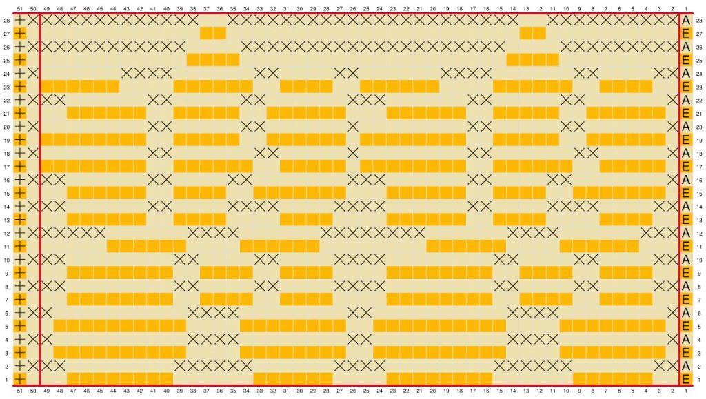 - The yarn colour changes with every row i.e. you ONLY use ONE colour per row – ignore any changes in colour of the chart squares, they simply show what the final design will look like. You will need to fo at the end of every row.