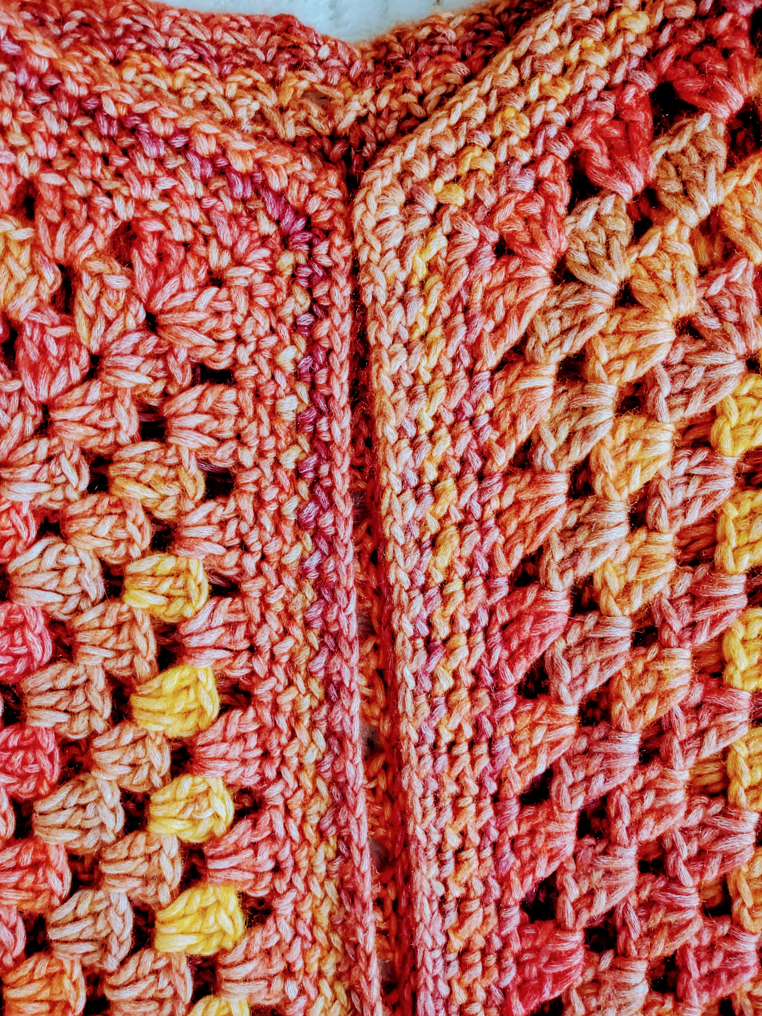 Round 1: With the right side facing , join yarn with sl st at the top of the center back , ch1 (does not count as stitch), (sc, ch1, sc) in the same st, # ch1, sk next ch1 sp, sc in next sc, repeat from # till you reach the start of the shoulder seam, ch1, sc in the seam join , * ch1, sk next dc, sc in next dc, ch1, sk next dc, ch1, sc in the next ch1 sp,* repeat from *..* till you reach the ch1 sp of the shell at the top left front, ch1, (sc, ch1, sc ) in the ch1 sp of the shell, repeat the instructions from *…* till you reach the shell at the left bottom hem, ch1, (sc, ch1, sc) in the ch1 sp of the shell, repeat the instructions from *…* along the entire back hem [making sure to make (sc, ch1, sc) at the seam join at the lower center back] , and reach the shell ch1 sp at the right bottom hem, ch1, (sc, ch1, sc) in the ch1 sp of the shell, repeat the instructions from *…* till you reach the ch1 sp of the shell at the right front bottom hem, ch1, (sc, ch1, sc) in the ch1 sp of the shell, repeat the instructions from *…* all the way up the right front till you reach the shell at the right front neck , ch1, (sc, ch1, sc) in the ch1 sp of the shell, repeat the instructions from *…* across the right front neck opening till you reach the shoulder seam , ch1, sc in the seam join, # ch1, sk next ch1 sp, sc in next sc, repeat from # till you reach the center back, join with sl st to the first sc.