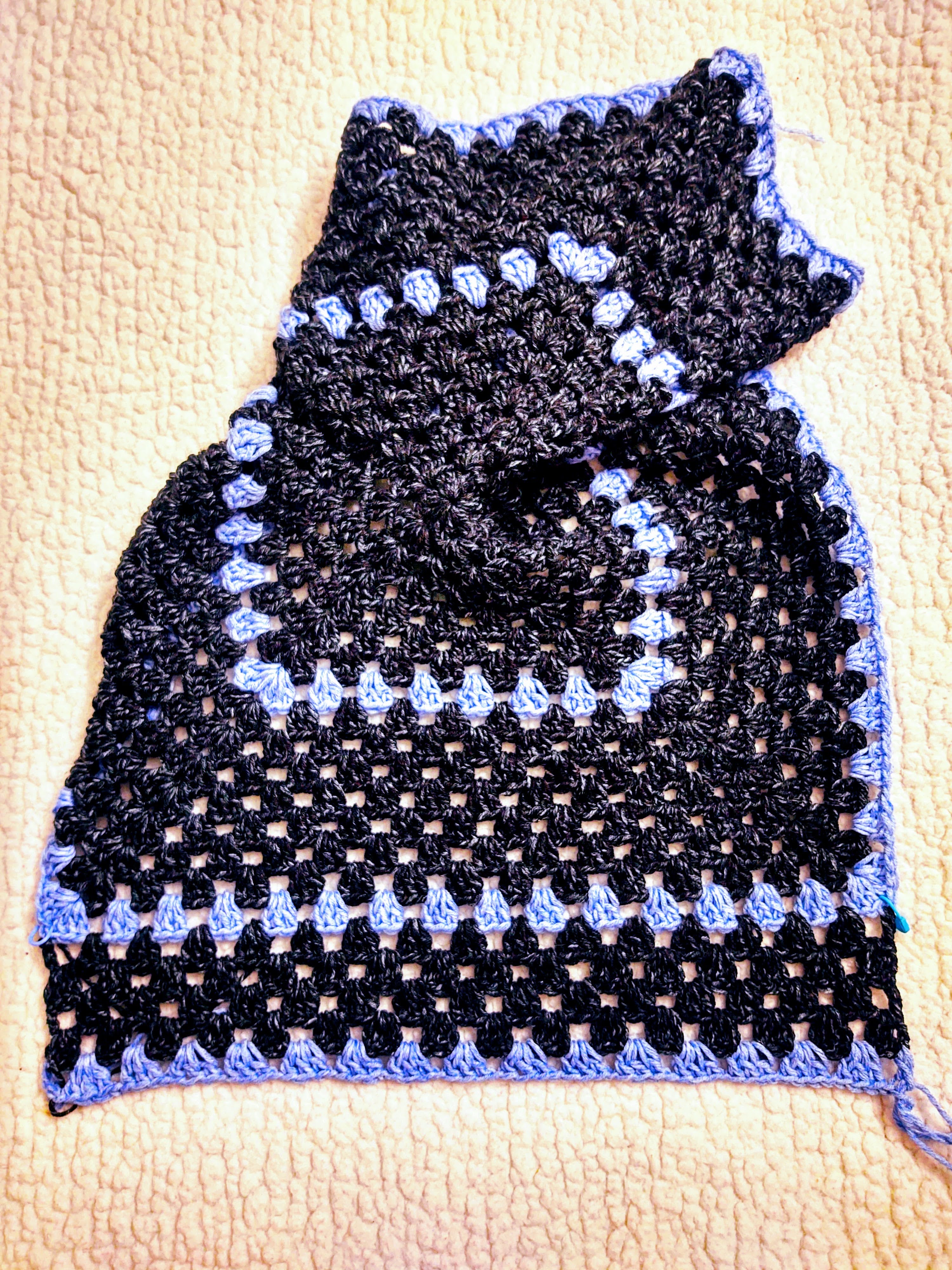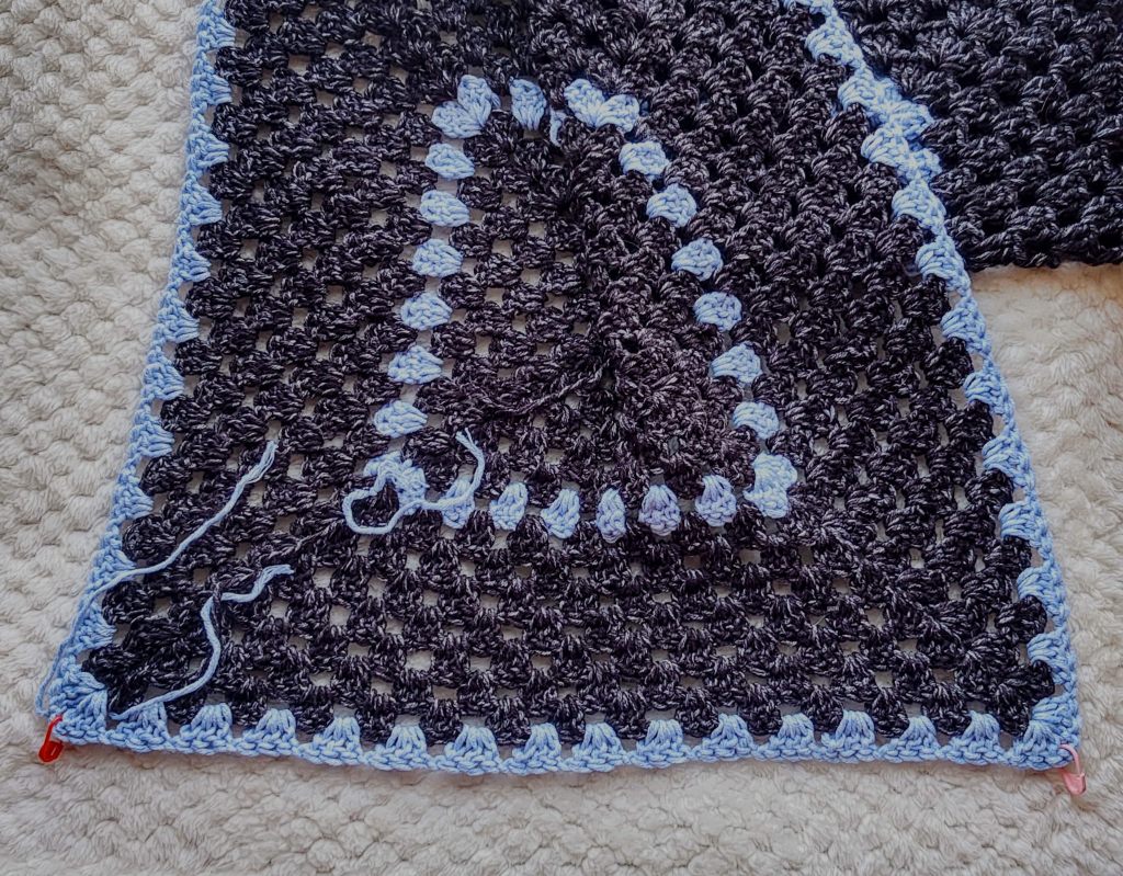 Now we need to increase the lower portion of the cardigan. You can do it by first seaming the back and then going around the entire bottom hem following the granny stitch pattern . However, I find that this gives a skirt like construction and I am not a fan of this. That said if you prefer to do it that way, do go ahead and skip the following instructions.